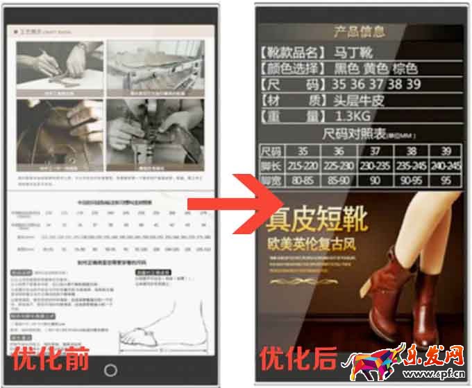 優化前:寶貝信息和寶貝描述文字過小,買家無法看清寶貝信息。出現這種情況的原因是我們直接將PC端的圖片和文字信息放在了無線端。