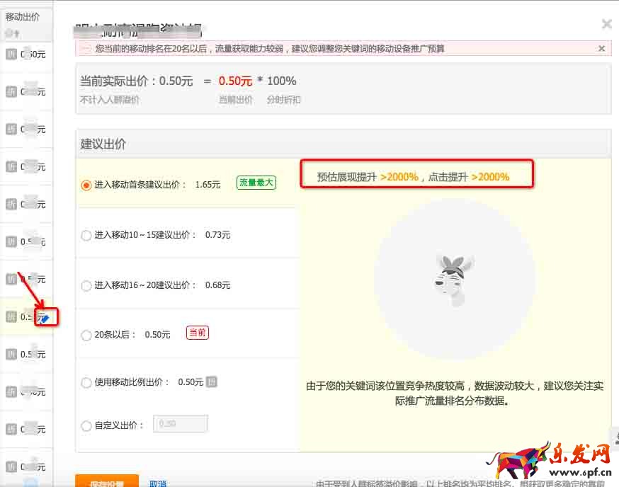 出價的最終目的,還是為了能獲得流量,覆蓋更多的客戶,才能為店鋪增加潛客。和更多的消費(fèi)者產(chǎn)生聯(lián)系。所以在蓄勢期,我們可以參考出價指導(dǎo),了解預(yù)估的展現(xiàn)提升,根據(jù)自己的流量需求,盡量排名到前面。