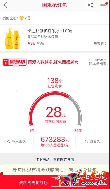 3)進入商品圍觀詳情頁,點擊頁面下方的“立即圍觀”參與圍觀,紅包面值會根據圍觀人數增加而上漲;