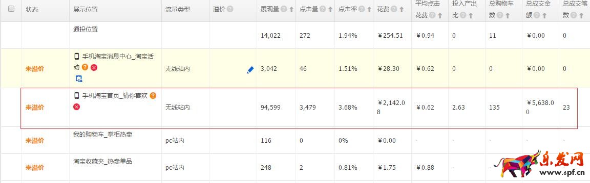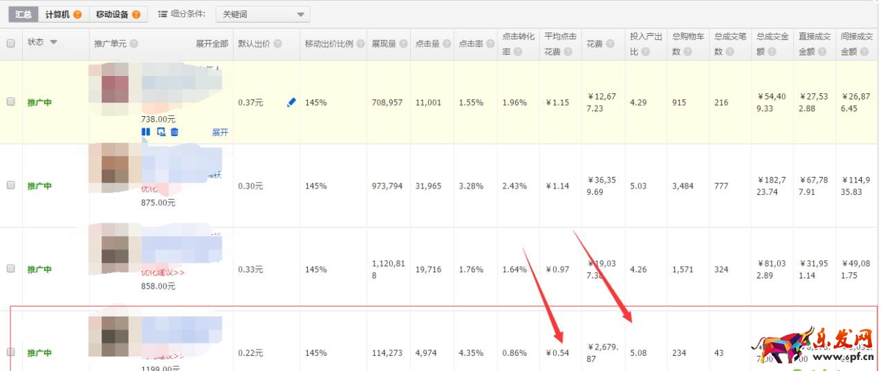 可以看到,ppc在0.64的情況下,投產只有2.32,也就是說,優化PPC的時候,我們一般是習慣整體調控,也就是說,今天PPC是0.8元,ROI2.5,我們想把投產做到3,那么PPC降到0.64就可以了。(至于為什么是0.64,我這里不再去算)但是,我們有部分實際上不需要降價,剛才那個ROI 2.5,細分到關鍵詞和定向,關鍵詞的ROI如果是3,定向的ROI是2,花費一樣。那么關鍵詞是不需要降的!所以說我們要單獨建立定向計劃!本身定向和關鍵詞的轉化都差很多。