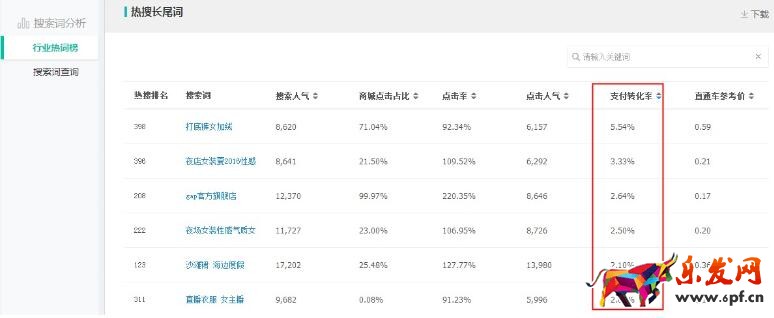 不要總搶大詞,因為大詞競爭激烈,關鍵詞不精準,轉化率會低。作為小賣家,高轉化的長尾詞是很好的選擇。如下圖:(生意參謀-市場行情-行業熱詞榜-熱門長尾詞)