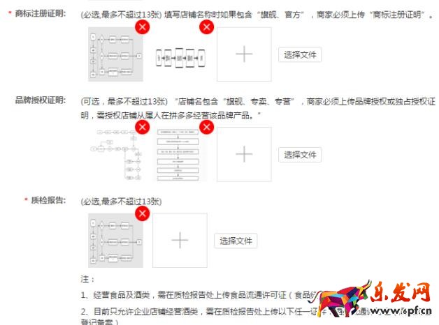 J、店鋪名包含“旗艦、專賣、專營”,商家必須上傳品牌授權或獨占授權證明,需授權店鋪從屬人在拼多多經營該品牌產品。 可上傳多圖,點擊圖片右上角的×,可刪除圖片;