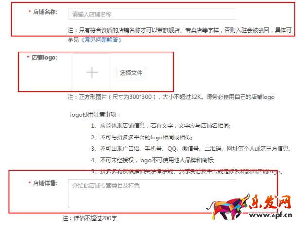 上傳完入駐資質后,進入到填寫店鋪信息階段,商家只需要填店鋪名、上傳店鋪 logo、補充店鋪詳情說明即可。具體嗎,按照頁面上標注的格式要求填寫。