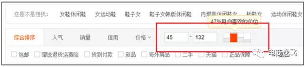 所以這里告訴大家一個非常簡單的小方法,去制定合理的價格區間。你總該要知道你準備銷售的真實價格吧,然后你在搜索結果頁看看你這個價格在哪個價格柱,你點擊一下那個價格柱。比如,我們以“休閑鞋女”為例,你準備賣128元錢,看下圖紅框中: