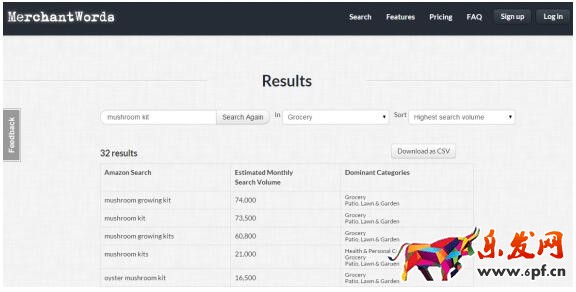 MerchantWords還能通過算法確定輸入字詞的關聯關鍵詞的每月搜索次數。不過有賣家表示對這一數據結果存疑。比如一個月內,有7.35萬人在亞馬遜搜索“mushroom kit”,卻只有1300人在谷歌搜索同樣的詞,這一數據不太可信。