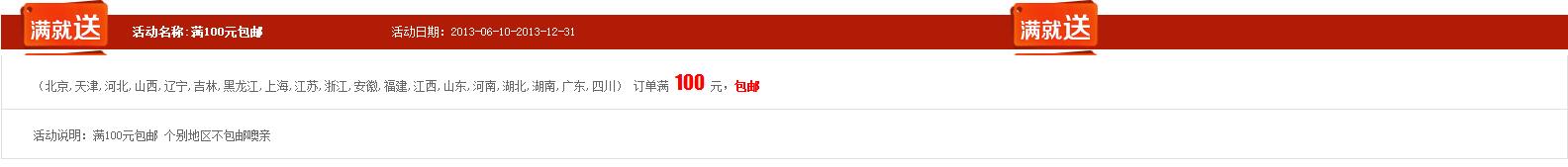 <table background="http://img02.taobaocdn.com/imgextra/i2/1640026267/T2fs6FXXdbXXXXXXXX-1640026267.jpg" class="" height="28" width="100%"> <tbody> <tr> <td> <div style="height:28px;padding:23px 0 0 130px;"> <span style="line-height:14px;color:#FFFFFF;font-size:12px;font-weight:bold;">活動名稱:滿100元包郵</span><span style="line-height:14px;color:#FFFFFF;font-size:12px;padding-left:130px;">活動日期:2013-06-10-2013-12-31</span></div> </td> </tr> </tbody> </table> <div style="width:92.8%;border:1px solid #E0E0E0;border-top:0;float:left;padding:14px 5% 10px 2%;"> <span style="font-size:12px;color:#666666;line-height:25px;">(北京,天津,河北,山西,遼寧,吉林,黑龍江,上海,江蘇,浙江,安徽,福建,江西,山東,河南,湖北,湖南,廣東,四川) 訂單滿 <font style="font-size:20px;font-family:impact;color:red;">100</font> 元,<font style="color:red;font-weight:bold;">包郵</font></span></div> <div style="width:92.8%;border:1px solid #E0E0E0;border-top:0;float:left;padding:14px 5% 10.0px 2%;"> <span style="font-size:12px;color:#666666;line-height:25px;">活動說明:滿100元包郵 個別地區(qū)不包郵噢親</span></div>