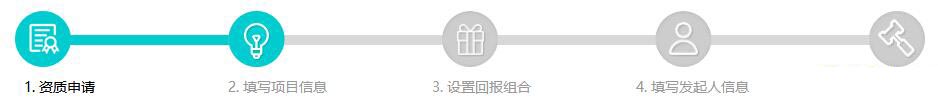 可以看到眾籌的流程第一步是資質(zhì)申請,第二步需要你填寫項目信息,第三步設(shè)置回報組合,第四步填寫發(fā)起人信息,第五步等待審核。