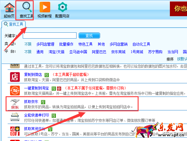 1.下載甩手工具箱,鏈接:http:///products/ToolBox/注冊并登陸,點擊查找工具,找到抓取京東。