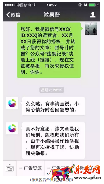 首先,你得有信心人家愿意事后給你授權(quán),否則就得自個(gè)兒找角落哭去了。其次,微果醬收到不少反饋,即使拿到了授權(quán)證明,也不是100%能通過(guò)申訴的。因此建議大家別心存僥幸或冒險(xiǎn)打擦邊球,抄襲、侵權(quán)不碰為妙,在沒(méi)有獲得授權(quán)之前,還是乖乖去溝通協(xié)商吧。而且未雨綢繆,保存好授權(quán)憑證,以應(yīng)付不知道哪里冒出來(lái)的惡意舉報(bào)。讓好的內(nèi)容得以更好的傳播,相信不少原創(chuàng)號(hào)很樂(lè)意授權(quán)給靠譜的微信公眾號(hào)的。與其抄得膽戰(zhàn)心驚,不如轉(zhuǎn)得坦然舒心。g'jG4n]*AU"vV