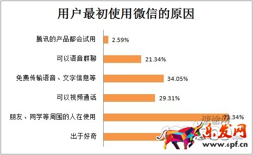 通過上面圖表,71.34%用戶選擇“因為朋友、同學等周圍的人都在使用”這一原因,微信是一個社交軟件,更多的來自圈子推廣和口碑宣傳;有47.41%的用戶出于好奇而嘗試使用微信,這些創新采用者也是微信的第一批用戶,“免費傳輸語音、文字信息等”也是用戶最初嘗試用微信的一個重要原因,正時這些免費的功能吸引著用戶使用,并通過社交圈子來傳播。