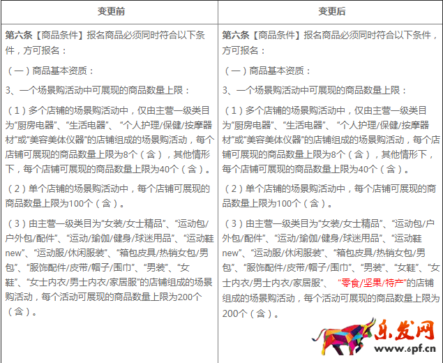 本次招商標準的變更出現在場景購中,商品報名條件主營一級類目新增“零食/堅果/特產”類店鋪,本次淘搶購場景購招商標準具體修訂內容如下: