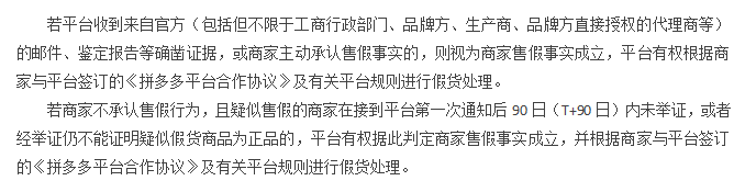 還有鑒于拼多多平臺排查、判定假貨的依據可能涉及平臺或品牌方商業秘密,若商家銷售的商品被判定為疑似假貨或假貨,拼多多平臺將通知商家其構成售假的結論,但有權視所涉商業秘密的等級決定是否披露判定的依據以及披露的內容。