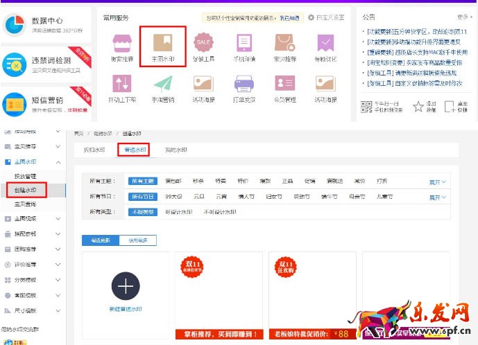 進(jìn)入超級(jí)店長(zhǎng)以后,點(diǎn)擊主頁的“主圖水印”(見上圖),接著點(diǎn)擊“創(chuàng)建水印”,選擇“普通水印”,因?yàn)槠胀ㄋ】梢宰杂删庉嫛8鶕?jù)系統(tǒng)提供的水印模板進(jìn)行編輯,價(jià)格、優(yōu)惠、雙十二的氛圍標(biāo)等等,最后添加商品進(jìn)行投放即可。