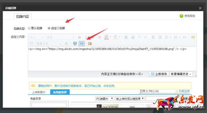 店鋪招牌裝修:鼠標放到店鋪招牌板塊中,此時可以看到“編輯”按鈕,點擊“編輯”,然后點擊“自定義招牌”,再點擊代碼按鈕,把上傳到圖片空間中的圖片地址復制到編輯框中。店招尺寸:高度是120.帶狀態欄150.寬950.狀態欄是30