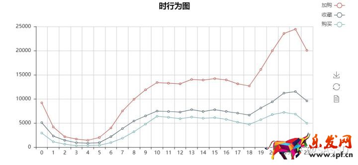 根據上圖可以看出,每天的加購、收藏和購買量都幾乎沒什么變化,而點擊和瀏覽量在第二周的周末有明顯的增加,但是第一周的周末卻沒有增加,推測可能是由于剛過完雙11沒多久,用戶的資金不是很充足,之前購買的物品還沒有完全消化掉。