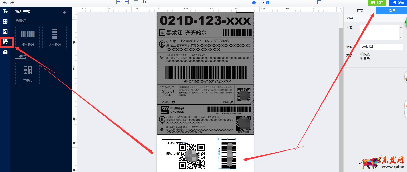 點擊添加二維碼或者 條形碼——再點右側(cè)的【配置】——在內(nèi)容中輸入網(wǎng)址或者條形碼數(shù)字即可