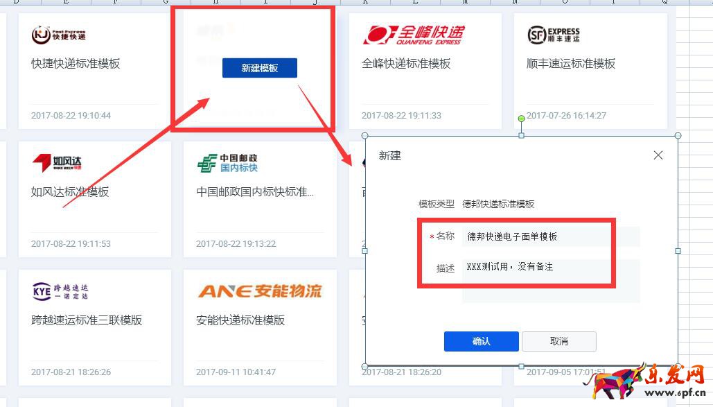 3、點擊【新建模板】,在彈出的頁面框中,找到你相對應(yīng)的物流公司【新建 模板】——在彈出的對話框中,輸入你的模板名稱(名稱隨便輸入,比如德邦快遞2017 ),