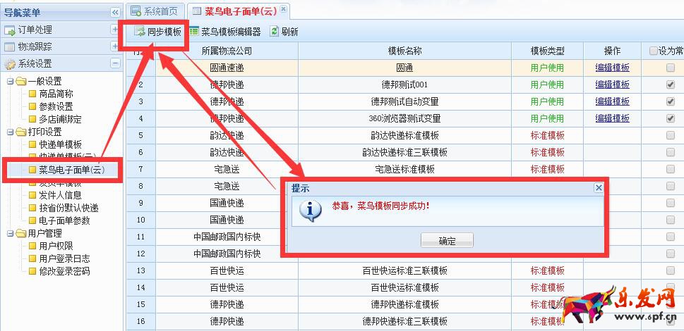 并且一定一定要再次進入【系統(tǒng)設(shè)置】——打印設(shè)置【菜鳥電子面單(云)】——點擊【同步模板】——把最新編輯好了的自己命名的模板同步到軟件中來———如果先前已經(jīng)獲取過一次單號——然后又更改了模板內(nèi)容——那么一定要重新 獲取 一下單號——打印出來的才是你編輯后的模板內(nèi)容。