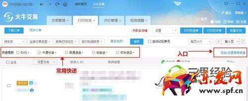 通過千牛插件進入軟件,點擊上方的“批量打印發貨”里面點擊“添加/設置常用快遞”按鈕進入設置界面。