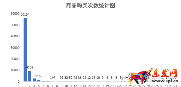 本次分析的商品共有64440中,用戶購買的商品共有16743種,購買數量非常集中的商品比較少;在本次統計的數據中,只購買一次的商品有56154種,占用戶購買商品數的79.26%,說明商品售賣主要依靠長尾商品的累積效應,而非爆款商品的帶動。
