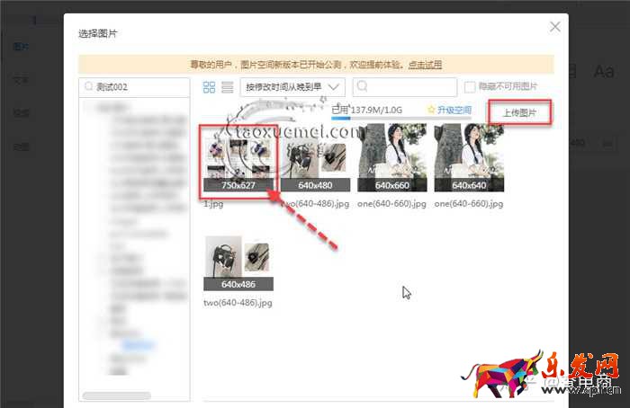 4、點擊之后彈出選擇圖片的界面,如果已經上傳到圖片空間,那么找到并且點擊選中,如果沒有上傳,可以點擊【上傳圖片】,先把圖片上傳到圖片空間,然后選中圖片,點擊確定。