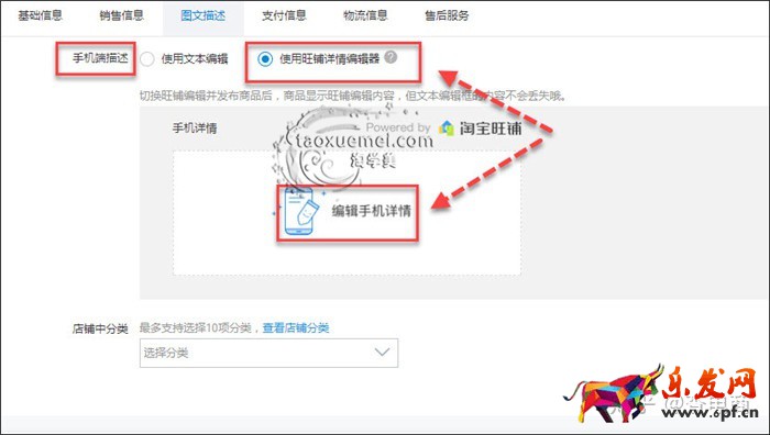 1、進入賣家中心,然后在進入出售中的寶貝頁面,或者倉庫中的寶貝頁面,找到需要編輯的寶貝,并進入編輯頁面,繼續找到【手機端描述】一欄,由默認的【文本編輯】,切換為【使用旺鋪詳情編輯器】,然后點擊【編輯手機詳情】,如下圖所示: