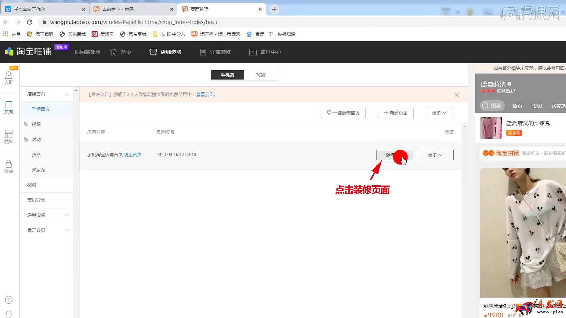 1.這節(jié)課主要講一下實(shí)操店鋪如何裝修動(dòng)圖模塊,打開【賣家中心】,點(diǎn)擊【立即裝修】。