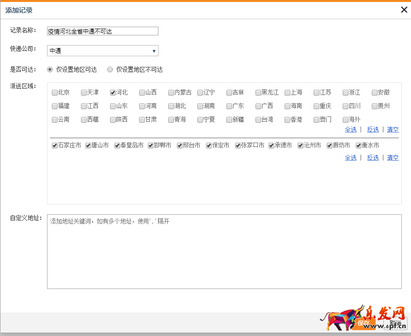 三、自定義設置快遞不可達地區,如:河北全省中通不可達。