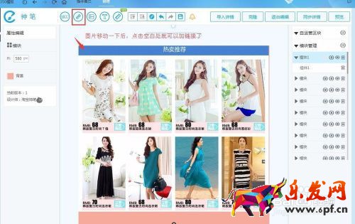 注意第七步:7、(重點(diǎn))加入鏈接技巧,默認(rèn)點(diǎn)擊圖片是無(wú)法加入鏈接的,需要把圖片移動(dòng)一點(diǎn)位置,可以向上移動(dòng)一下圖片,然后在空白處點(diǎn)擊,這時(shí)候左上角就出現(xiàn)了可以加鏈接,點(diǎn)擊鏈接直接選擇你需要的寶貝,可以添加多個(gè)鏈接,然后把熱點(diǎn)框的大小改變到合適大小。