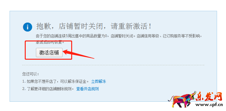 2、在開店里面會有一個提示框,點擊“激活店鋪”進行重新激活。