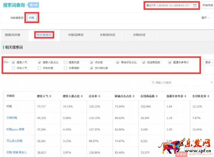 打開生意參謀,比如搜“奶瓶”這個關鍵詞,要想知道這個產品關鍵詞市場競爭度如何的話,可以到搜索詞查詢的“相關搜索詞”下面看詳細數據,結合寶貝搜索人氣、點擊率、商城占比以及在線商品數等選擇合適的關鍵詞。