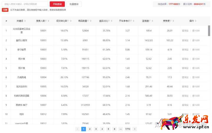 輸入關鍵詞即可獲得大量藍海詞數據,如果你想挖掘藍海市場,可以根據藍海值的大小判斷這個市場的藍海程度,如果發現了優質藍海市場,還可以點擊查淘寶或者查1688.一鍵前往貨源網站查看這個關鍵詞下的貨源,方便快捷。