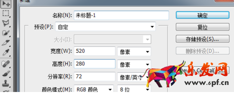 2.開啟PS,新建文件(小編選擇的是520px*280px的PC端首焦圖片演示,由于位置不同,鉆展圖片的要求也會有所不同)