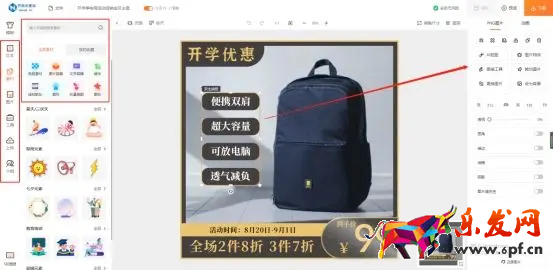 另外,在左側的【文本】、【素材】、【圖片】、【上傳】等選項中,則可添加其他的文本內容、在線圖片、本地圖片、圖標素材、文字容器素材、矢量圖、圖形素材、裝飾素材等至詳情頁圖片模板中,豐富詳情頁的內容與觀感。