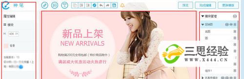 我們詳細(xì)分析一下這個編輯器的界面。神筆編輯界面其實(shí)很大程度上模仿的photoshop。主要分為三大塊。第一塊是左側(cè)的屬性編輯欄,第二塊是文檔窗口欄,第三塊是右側(cè)的活動面板欄。筆者是根據(jù)ps界面的名稱自定義的欄目名字。屬性欄主要有兩類,一類是圖片屬性,一類是文字屬性,還有一類是添加鏈接的屬性編輯熱區(qū),完全滿足了我們寶貝詳情的編輯需要,只要更改文字和圖片即可。再看右側(cè)的活動面板,可以顯示目前你的目標(biāo)活動選項(xiàng),顯示顏色為淡藍(lán)色。比如現(xiàn)在目標(biāo)活動選項(xiàng)是促銷圖。