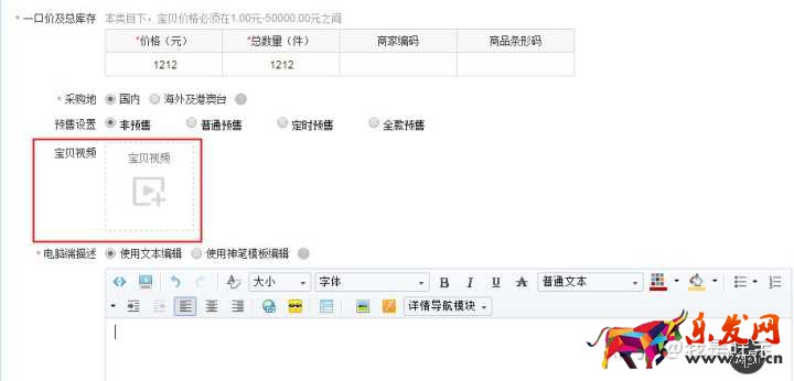 2.寶貝中選擇視頻:進入寶貝編輯頁面,點擊虛線框內(nèi)的【寶貝視頻】(如下圖)。選擇已經(jīng)發(fā)布的視頻就添加成功了
