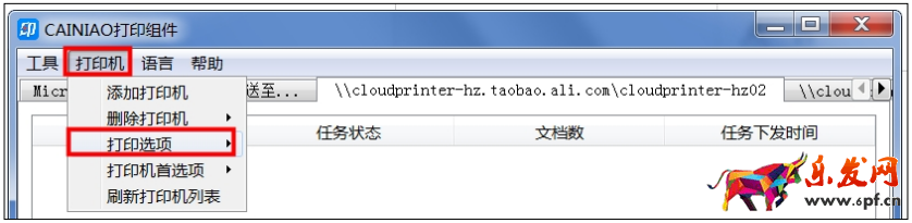 打開菜鳥打印組件應用,點擊頂部菜單欄【打印機】,點擊下拉框的【打印選項】,然后選擇指定的打印機。