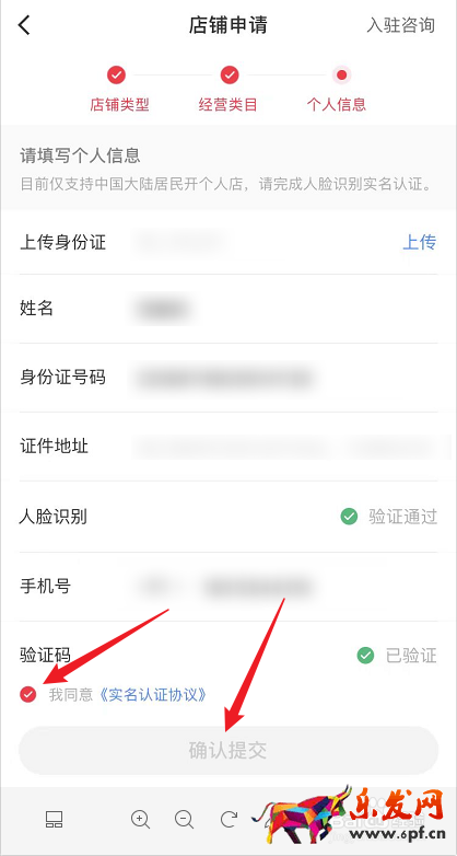 填寫完整個人信息后,勾選同意實名認證協(xié)議,點擊【確認提交】即可成功開通店鋪