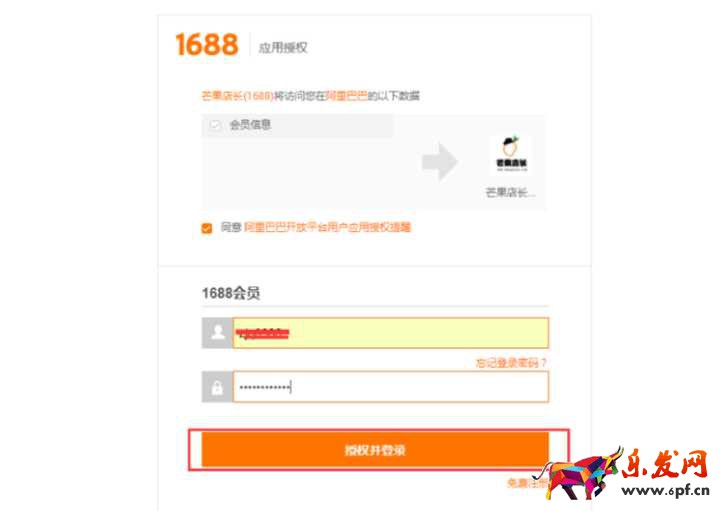 跳轉至1688授權頁面,填寫用戶名和密碼,點擊【授權并登錄】。