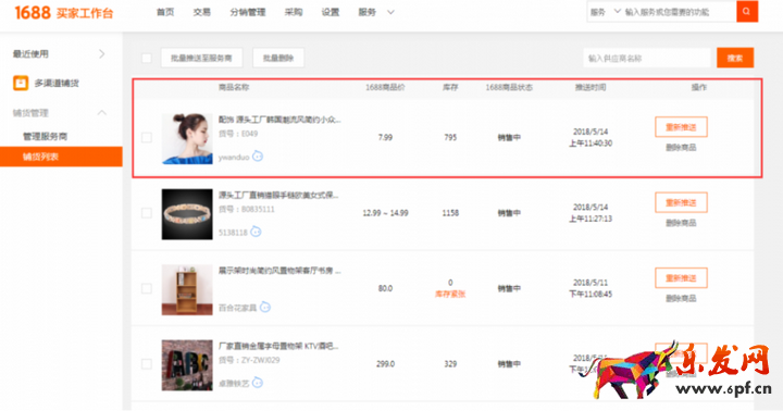 鋪貨成功,點擊【管理鋪貨】按鈕,進入1688買家工作臺查看鋪貨列表。
