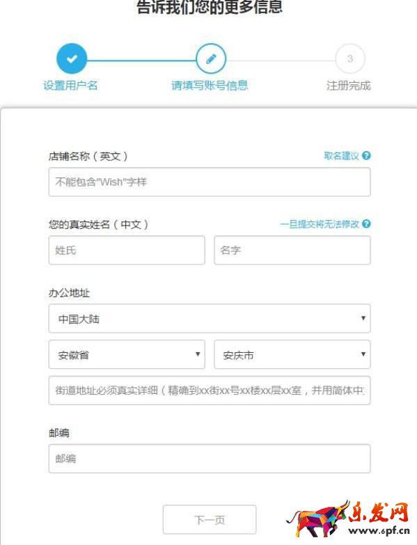 請輸入你的店鋪名稱,請確認你的店鋪名稱不能含有“Wish”的字樣。店鋪名稱一旦確定將無法更改。輸入你的姓氏和名字。所在的國家、省份、城市、街道地址以及郵政編碼。點擊“下一步”繼續(xù)你的注冊流程。