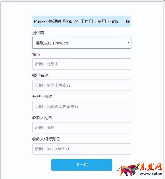 3.整個認證需要在15分鐘內(nèi)完成 請上傳您的身份證照片,點擊“下一步”進入支付的選擇。 此處我們將會展示如何添加收款信息,以便你的Wish業(yè)務(wù)開展后能正常收到貨款。 若使用易聯(lián)易聯(lián)(Payeco)收款,請選擇易聯(lián)。以下是信息填寫示例。
