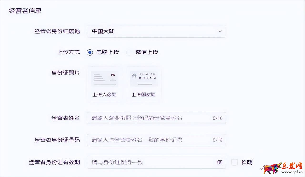 上傳店鋪經營者身份證的正反面照片,必須是二代身份證,不要有任何遮擋信息,內容清晰即可。