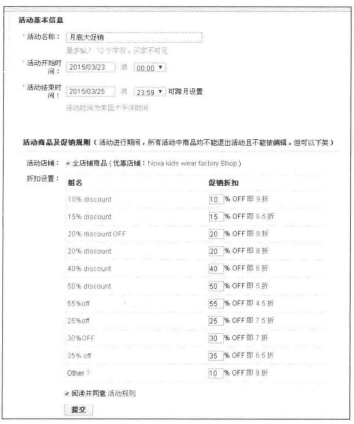 開始時間和結(jié)束時間,由于全店鋪打折的力度比較大,全店鋪打折時間不宜設(shè)置過長,最好持續(xù)時間為3天以內(nèi)。否則店鋪每天都在打折,給客人的印象就是你的店鋪就是打折店鋪,客人每天都在等你打折,沒打折就不下單,不利于店鋪的長期發(fā)展。