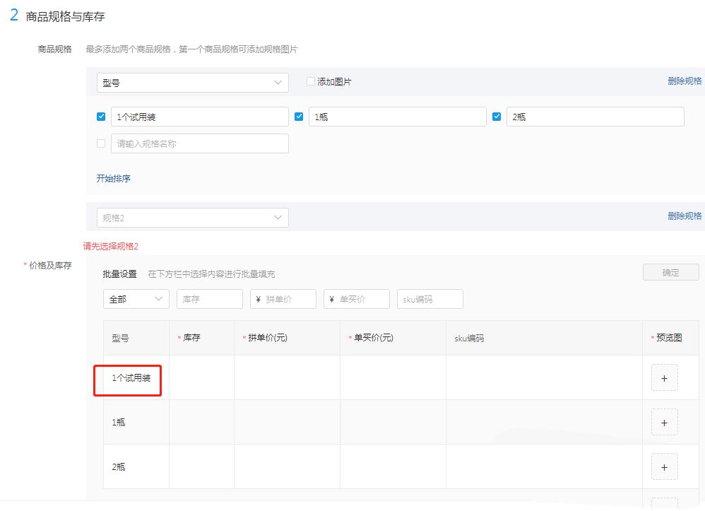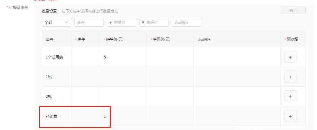 在規格SKU里添加低價規格,最常用的就是試用裝及補郵費的方式。