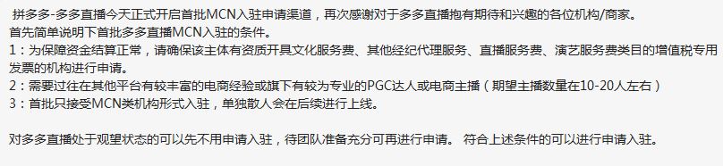 目前拼多多MCN機構只有MCN機構類企業才能申請入駐。