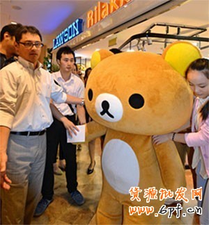 “超可愛哎!”令年輕女性興奮的是來自日本卡通形象的“輕松熊”。“輕松熊”一亮相,便吸引了眾多年輕女性前來拍照,轉(zhuǎn)眼間羅森門前排起了長隊(duì)。